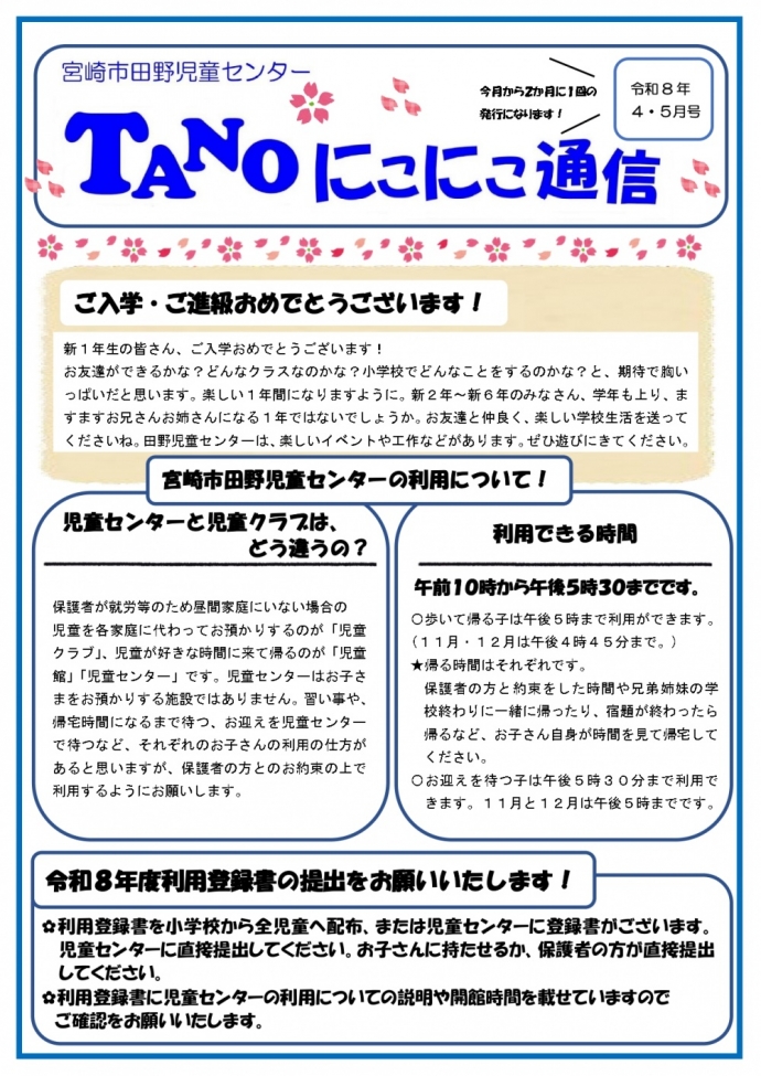 児童センターを利用されるお子さまは「田野児童センター利用登録書」の提出をお願いいたします。急病などの際、緊急に保護者に連絡をとる必要が生じることがありますので、必ず提出いただきますようお願いいたします。
