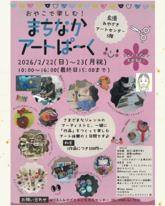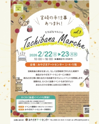 2月22日(日)〜23(月・祝)10:00〜16:00 *最終日は15:00迄みやざきアートセンターで「まちなかアートぱーく」&「たちばなマルシェ」を開催します!