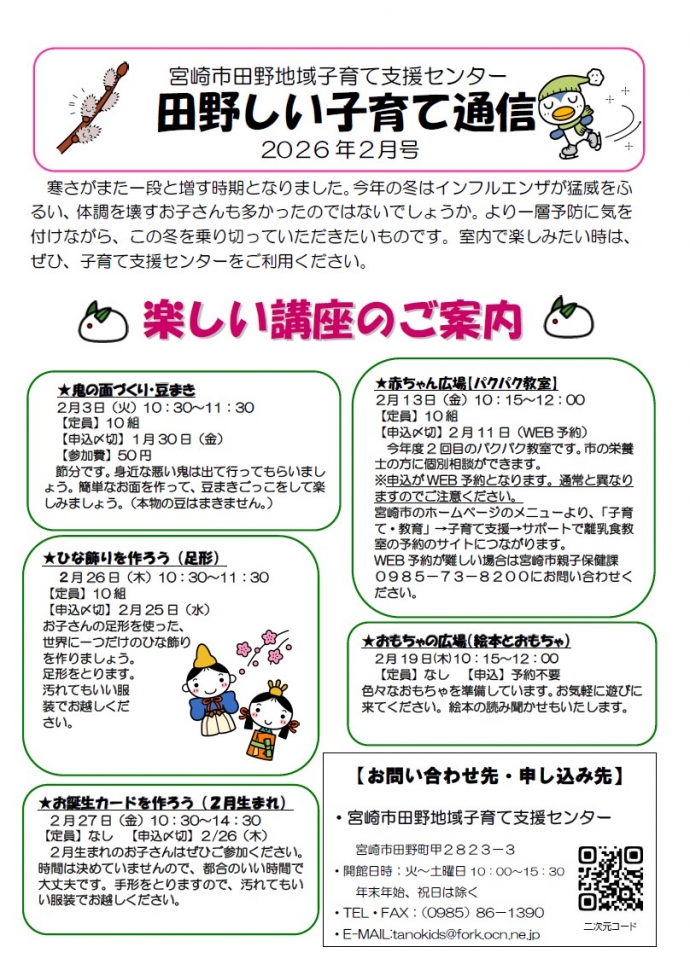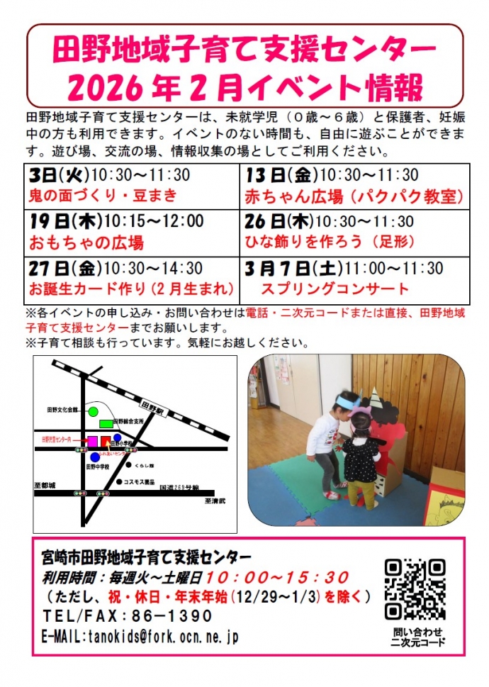 宮崎市から委託を受け『宮崎市田野地域子育て支援センター』を運営しています。